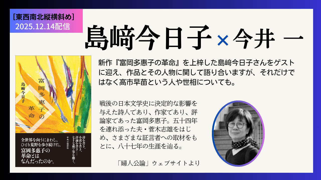 2025年11月20日に、新作『富岡多惠子の革命』を上梓する島﨑さん。この作品とその人物に関してたっぷり話してもらいますが、それだけではなく、高市早苗という人や世相についても、今井一と語り合います。
