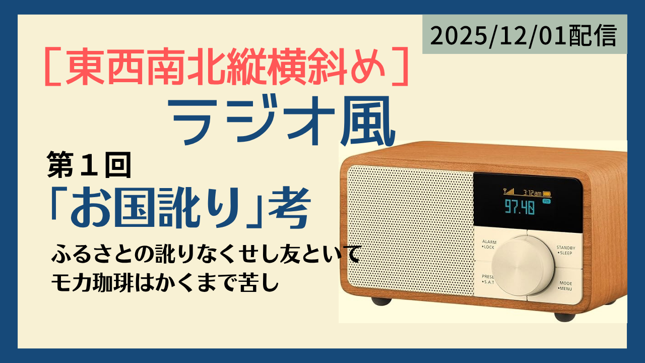 今風に言えば「ポッドキャスト」、要するに[東西南北縦横斜め]ラジオ風(ふう)です。その第1回は「お国訛り」考。石川啄木や寺山修司、はたまた勝新太郎が映画「悪名」で演じる「八尾の朝吉」らを引き合いに出して今井一が語ります。