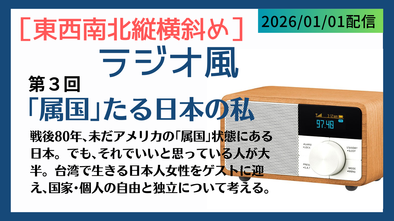 第3回「属国」たる日本の私。戦後80年、未だアメリカの「属国」状態にある日本。でも、それでいいと思っている人が大半。台湾で生きる日本人女性をゲストに迎え、国家・個人の自由と独立について考える。