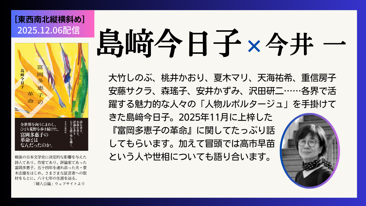 大竹しのぶ、桃井かおり、夏木マリ、天海祐希、重信房子、安藤サクラ、森瑤子、安井かずみ、沢田研二……各界で活躍する魅力的な人々の「人物ルポルタージュ」を手掛けてきた島﨑今日子さん。2023年『ジュリーがいた 沢田研二、56年の光芒』刊行時に[東西南北縦横斜め]に出演した彼女を再びゲストに迎え、先月上梓した新作『富岡多惠子の革命』の作品と人物に関してたっぷり話してもらいます。加えて、冒頭では高市早苗という人や世相についても、今井一と語り合います。