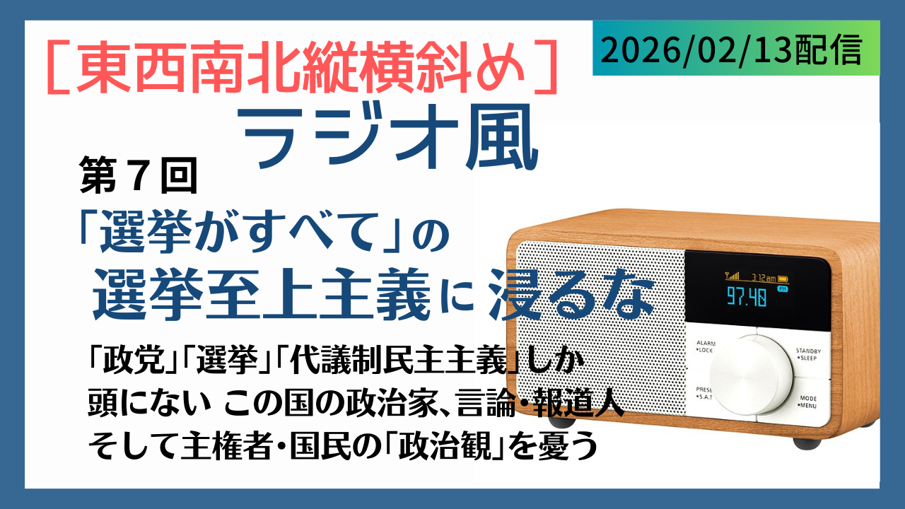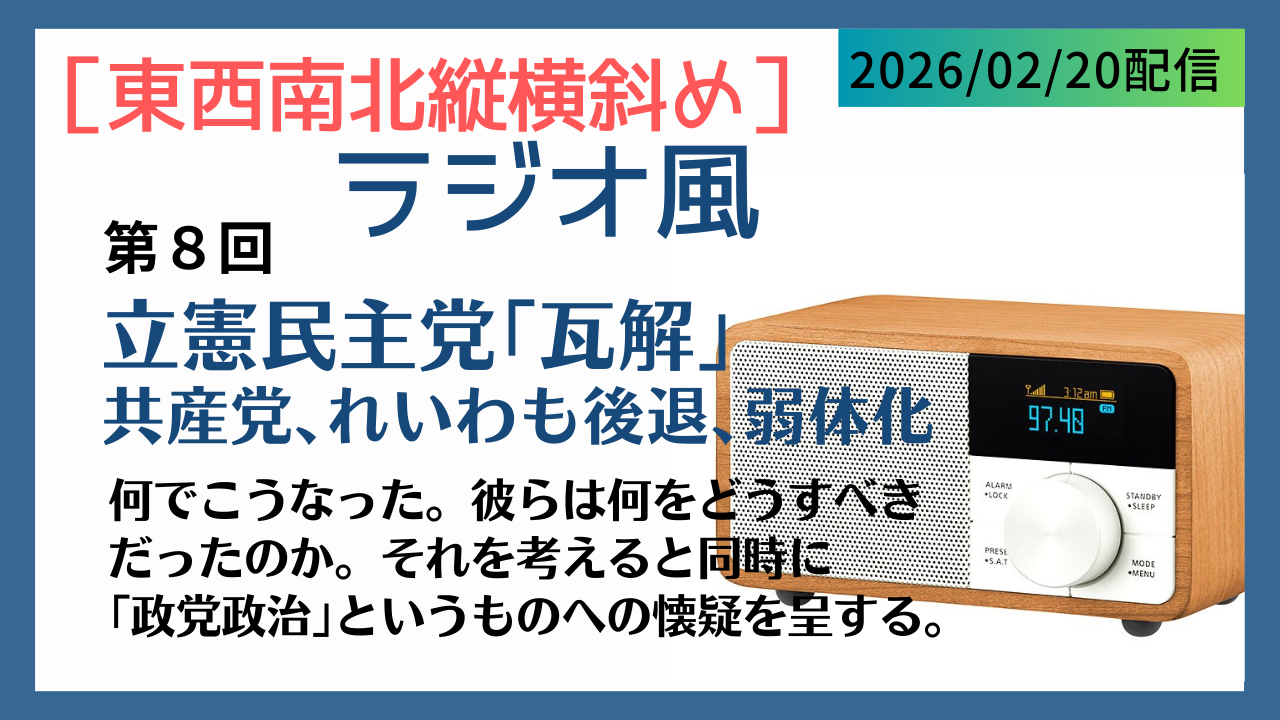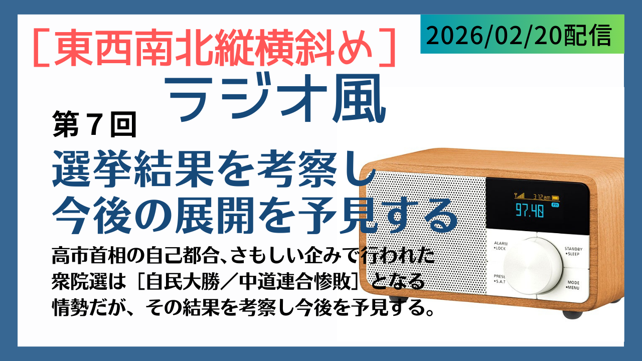 高市首相の自己都合・さもしい企みで行われた道理なき衆議院解散。そして、奇襲には奇襲をとばかりに企てた立憲・公明の「中道連合」戦略。この衆院選は[自民大勝/中道連合惨敗]となる情勢だが、その選挙結果を深く考察し今後の展開を予見する。
