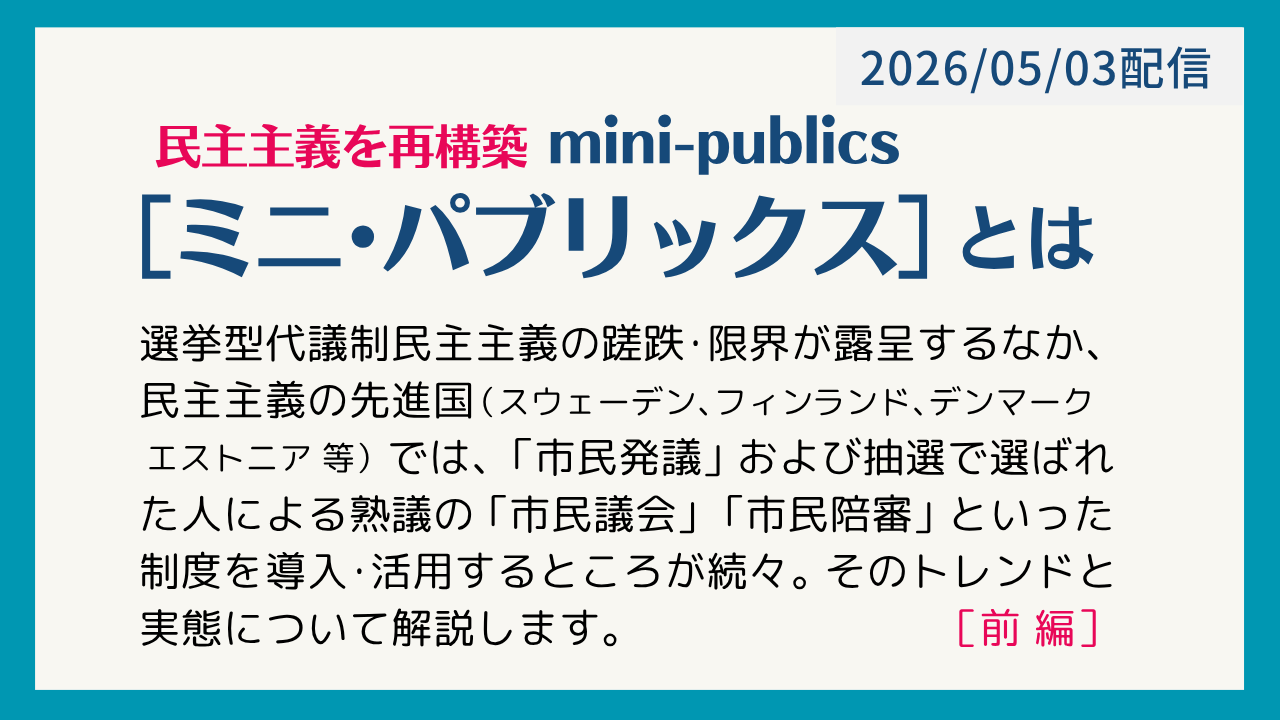 ミニ・パブリックス(mini-publics)とは、無作為抽出などの方法によって選ばれた市民が集まり、特定の政策課題について専門家の情報提供を受けながら、時間をかけて熟議を行う市民参加の手法です。選挙型代議制民主主義の蹉跌・限界が露呈するなか、民主主義の先進国(スウェーデン、フィンランド、エストニア等)では、「市民発議」および抽選で選ばれた者による熟議の「市民議会」「市民陪審」といった制度を導入するところが続々。そのトレンドと実態について解説します。