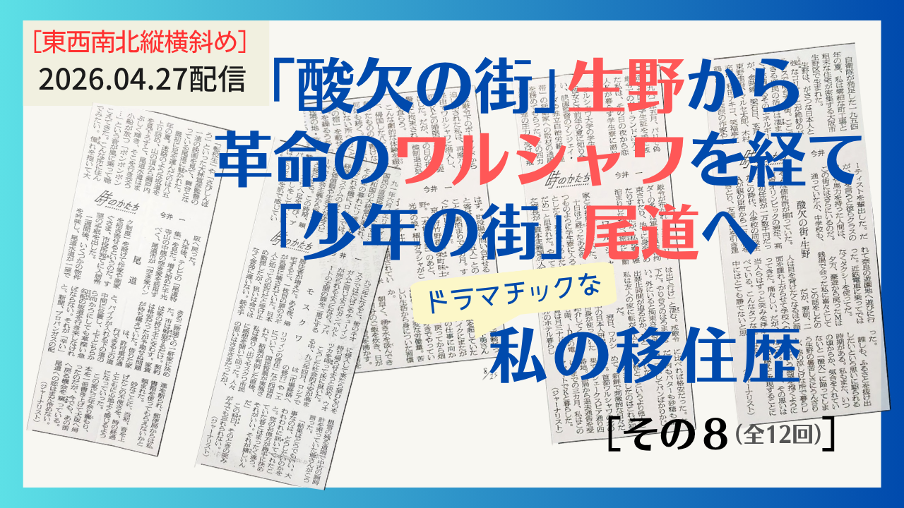 1982年5月に学生と偽ってビザを取り戒厳令下のワルシャワに入った私は、軍政当局に隠れて取材を重ねていましたが、自由と民主主義を求める人々の集合体「連帯」の動きは、軍政当局によってほぼ完全に制圧されたように見えました。だが……。 この回では戒厳令下で敢行された同時多発大規模デモや「脳膜炎」の疑いで病院に救急搬送されたときに体験した「社会主義社会の真相」などについて語ります。