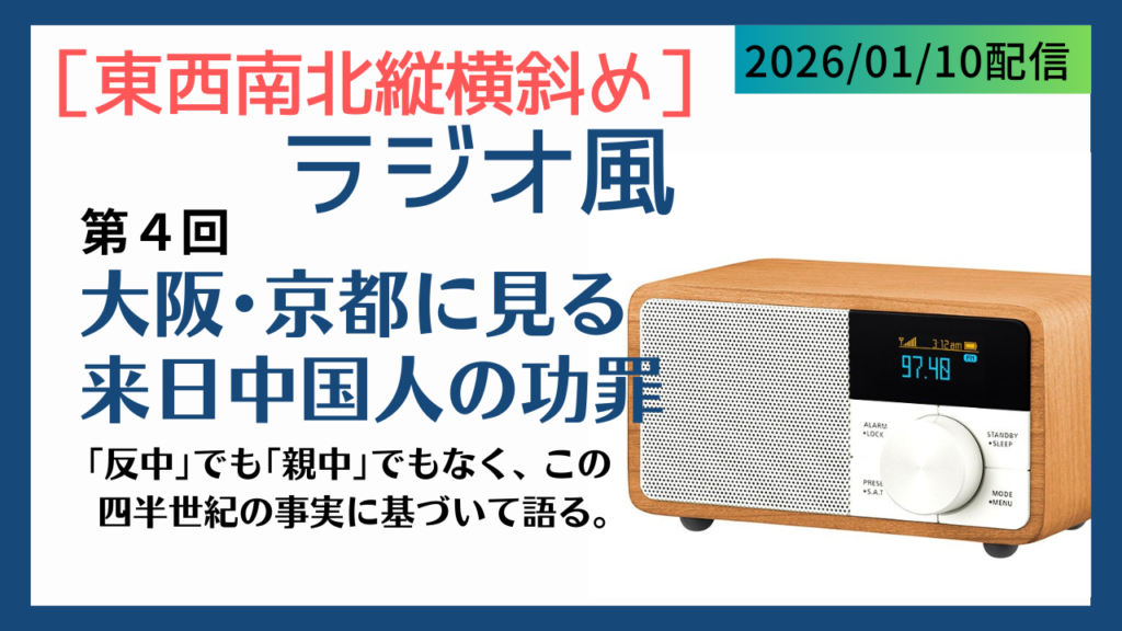 この四半世紀、飛躍的な経済成長を遂げ富裕層が一気に拡大した中国。そして、その経済力を背景に2000年頃から観光やビジネスを目的に日本に入ってくる中国人が加速度的に増えたが、その「功罪」はともに大きい。とりわけ、大阪や京都では飲食、ホテル、不動産などでの商取引や街の風景に与えた影響は甚大で、来日中国人の存在・活動を無視して大阪・京都の現状や未来を考察することはできない。この回では心斎橋でワインバーを営む大阪市民をゲストに迎え、中国人のもたらしたものについて具体的な話を紹介しながら語り合い考えたい。