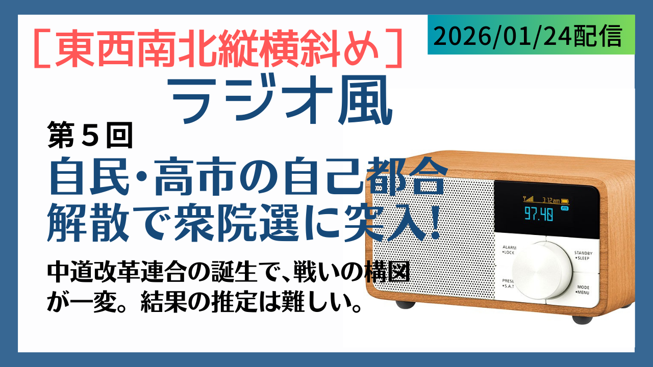 立憲+公明の中道改革連合の誕生によって高市政権の[自己都合(エゴ)解散⇒自民党圧勝]のシナリオは崩れました。