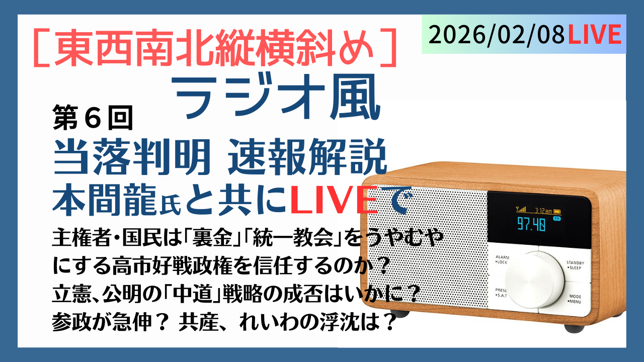 高市、吉村らの自己都合さもしい企みで行われた衆議院議員選挙と大阪府知事選・市長選。そして、奇襲には奇襲をとばかりに企てた立憲・公明の「中道連合」戦略。その結果を受け、選挙結果を考察し今後の展開を予見する。