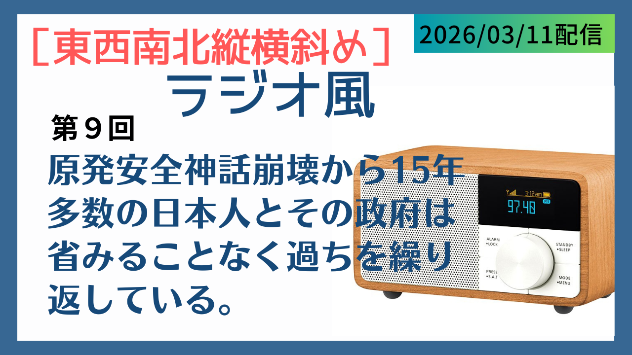 2011年3月11日に起きた東京電力福島第一原発の過酷な事故から15年が経過。あの直後は「原発を廃して(太陽光、風力などの)再生可能エネルギーへの転換を図るべし」という声が主権者・国民の過半数に達していた。だが、関西電力の福井での原発をはじめ再稼働はどんどん進んで今や14基に。そして、高市自民党政権はその動きを加速させようとしています。また、そうした動きと呼応するように「原発再稼動」に関する世論調査は、再稼働賛成が反対を上回っています。それはどの報道機関が行なったものでも同じ。つまり、多数の日本人とその政府は、過ちを省みることなくそれを繰り返そうとしている。この回では、そうしたことについて語り合っています。