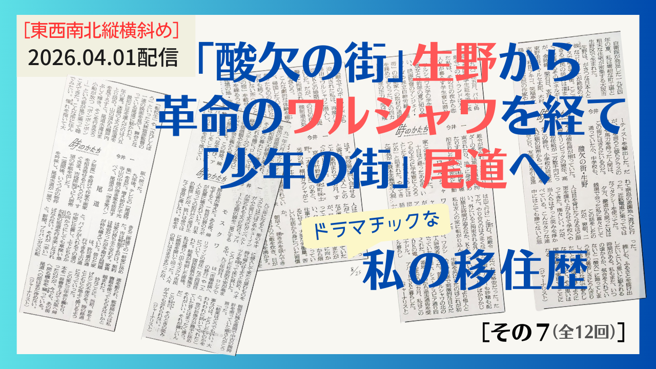 今風に言えば「ポッドキャスト」、要するに[東西南北縦横斜め]ラジオ風(ふう)です。その第1回は「お国訛り」考。石川啄木や寺山修司、はたまた勝新太郎が映画「悪名」で演じる「八尾の朝吉」らを引き合いに出して今井一が語ります。